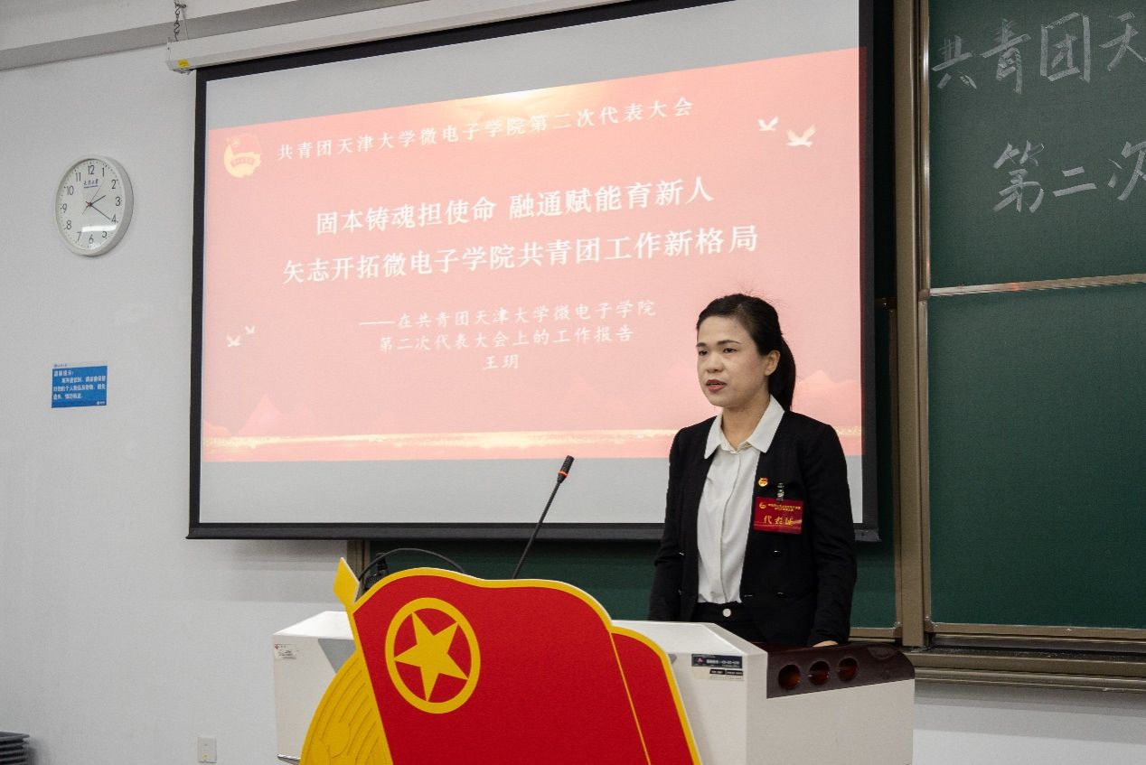 微电子学院团委书记王玥代表第一届委员会作了题为《固本铸魂担使命 融通赋能育新人 矢志开拓爱情岛论坛 共青团工作新格局》的工作报告。报告系统回顾了过去五年团委在筑牢信仰根基、锻造组织筋骨,贯通产学资源、激发创新动能,实践锤炼成长、展现青春风采,护航青年学生成长成才等方面的工作与成绩,并结合习近平总书记重要回信精神与学院发展实际,明确了未来一段时期的工作方向:一是深化引领,筑牢产业报国的青春信念;二是聚力赋能,搭建服务青年成长的广阔舞台;三是强基固本,激发共青团组织的内生动力;四是融入大局,引领青年在奋斗中实现价值。
