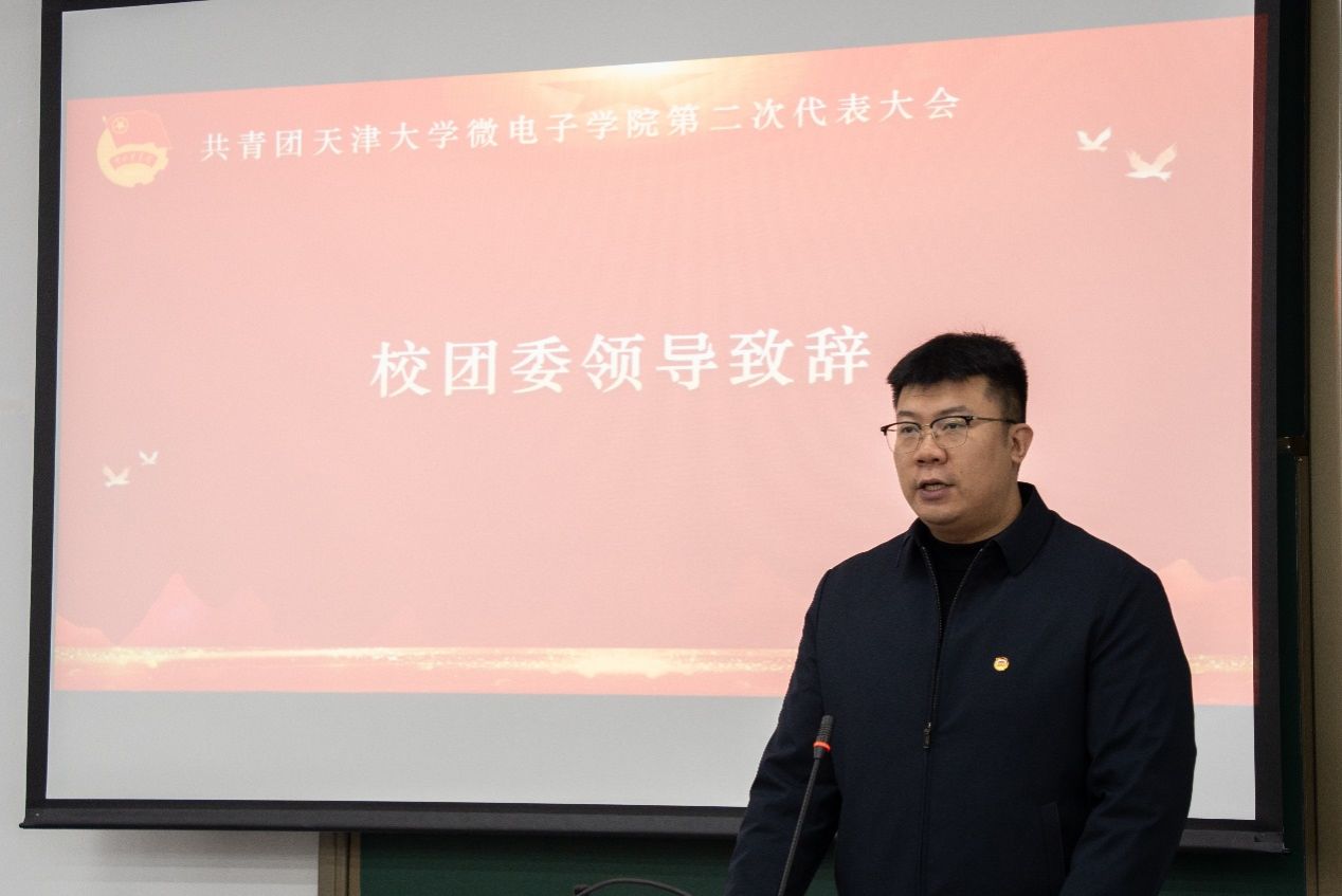 焦德芳代表校团委致辞,他首先对大会的召开表示热烈祝贺,他充分肯定了过去五年微电子学院团委在思想引领、组织建设、学生科创、服务青年等方面取得的扎实成效,并对未来工作提出三点希望:一是强化政治引领,夯实忠诚于党的青春根基。二是聚焦实践担当,点燃创新创造的青春引擎。三是紧扣改革强基,锻造坚强有力的基层组织。